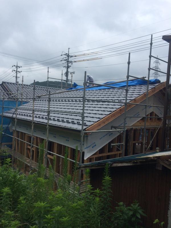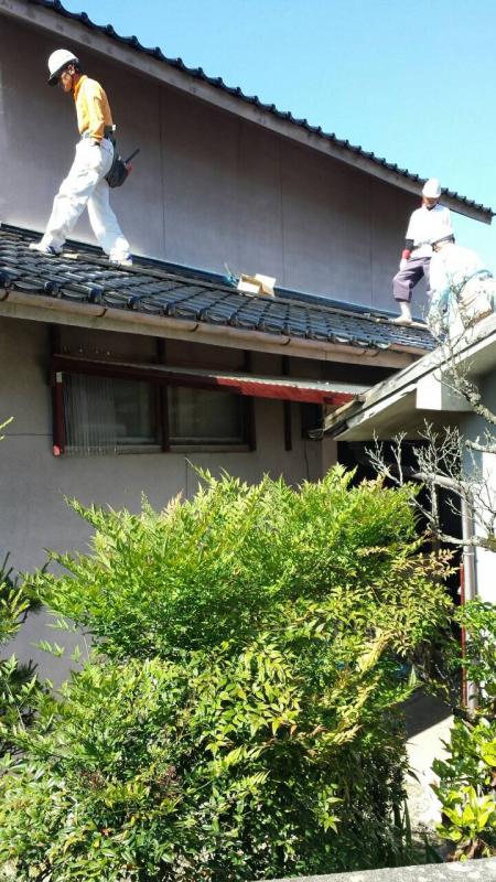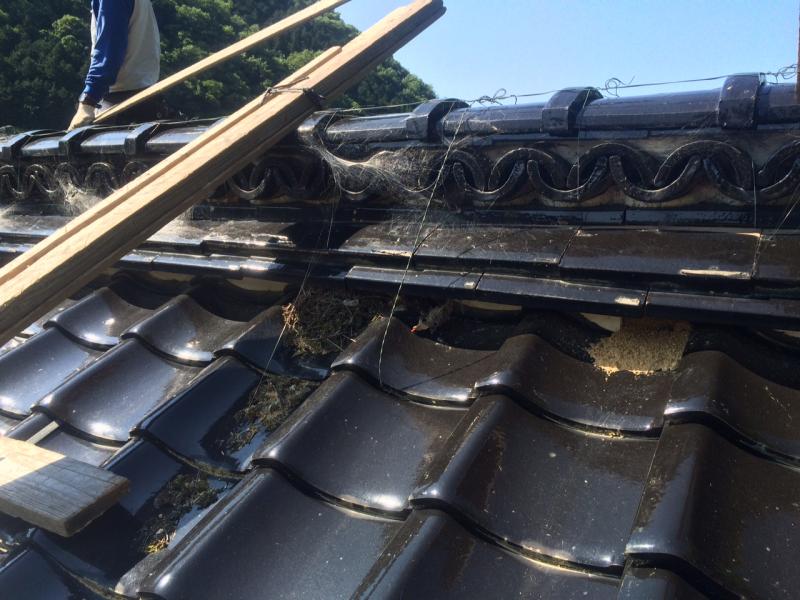 屋根の修理、本日は棟と隅棟の巻き替え工事と雨樋の掛け替えです。